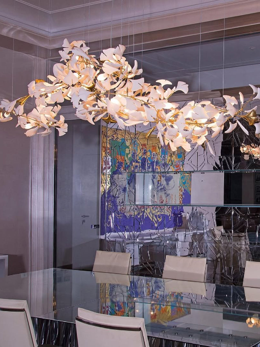 Each piece in this collection features delicate ceramic shades, mimicking the intricate form of ginkgo leaves.